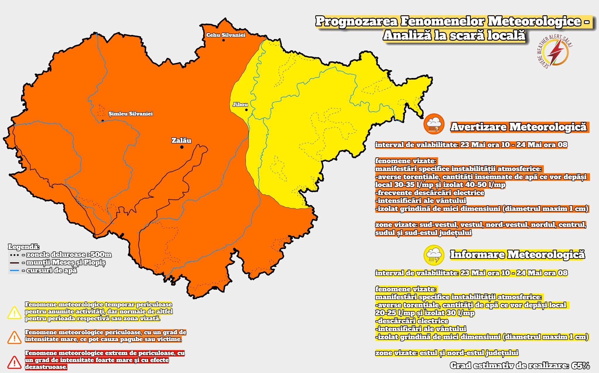 Meteorologii amatori de la Severe Weather Alert – Sălaj emit un avertisment privind o perioadă de precipitații însemnate ce va afecta județul. Până sâmbătă, la ora 8:00, se așteaptă averse torențiale, cu cantități de apă ce pot depăși 30-35 l/mp și local 40-50 l/mp. Fenomenele însoțitoare includ descărcări electrice, intensificări ale vântului și, izolat, grindină de mici dimensiuni (maxim 1 cm).