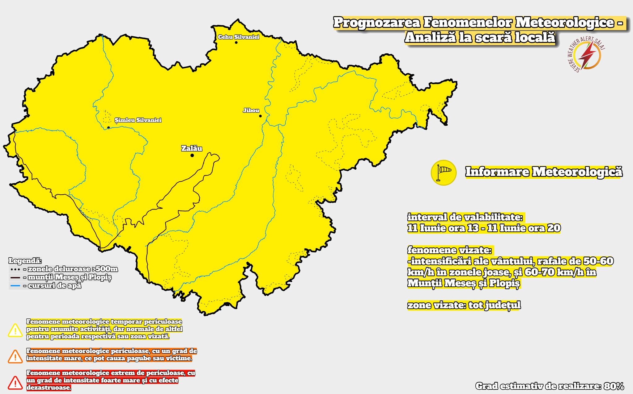 Miercuri, între orele 13:00 și 20:00, județul Sălaj se află sub un avertisment de intensificări ale vântului. Conform prognozelor, sunt așteptate rafale care pot depăși 55-70 km/h, ceea ce poate provoca disfuncții în rețelele de electricitate și daune minorilor la construcții.
