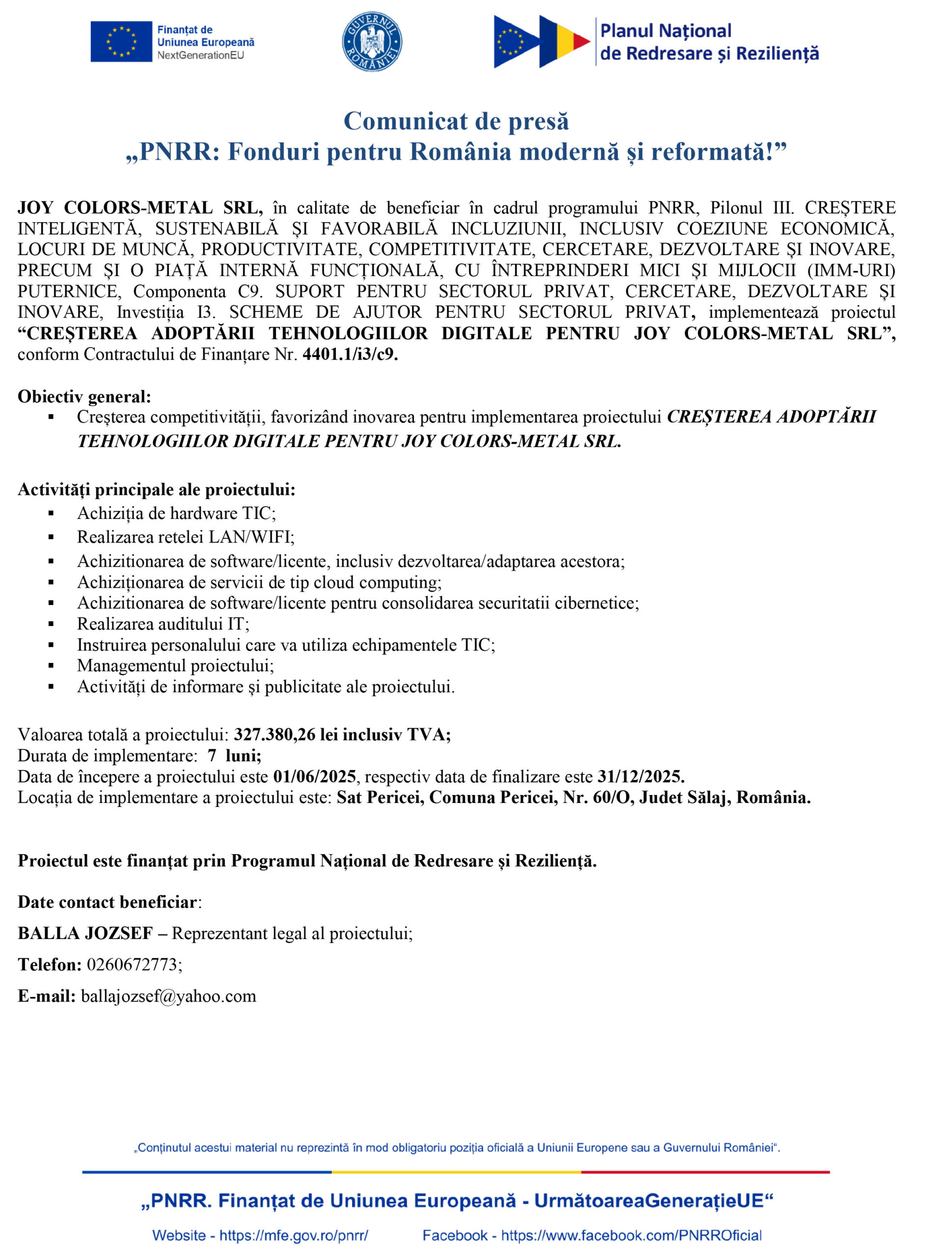 Joy Colors-Metal SRL, o companie din România, a fost selectată ca beneficiar în cadrul programului PNRR (Programul Național de Redresare și Reziliență), sub Pilonul III, destinat susținerii creșterii inteligente și durabile. Proiectul, intitulat „Creșterea adoptării tehnologiilor digitale pentru Joy Colors-Metal SRL”, vizează îmbunătățirea competitivității prin implementarea unei serii de tehnologii avansate.